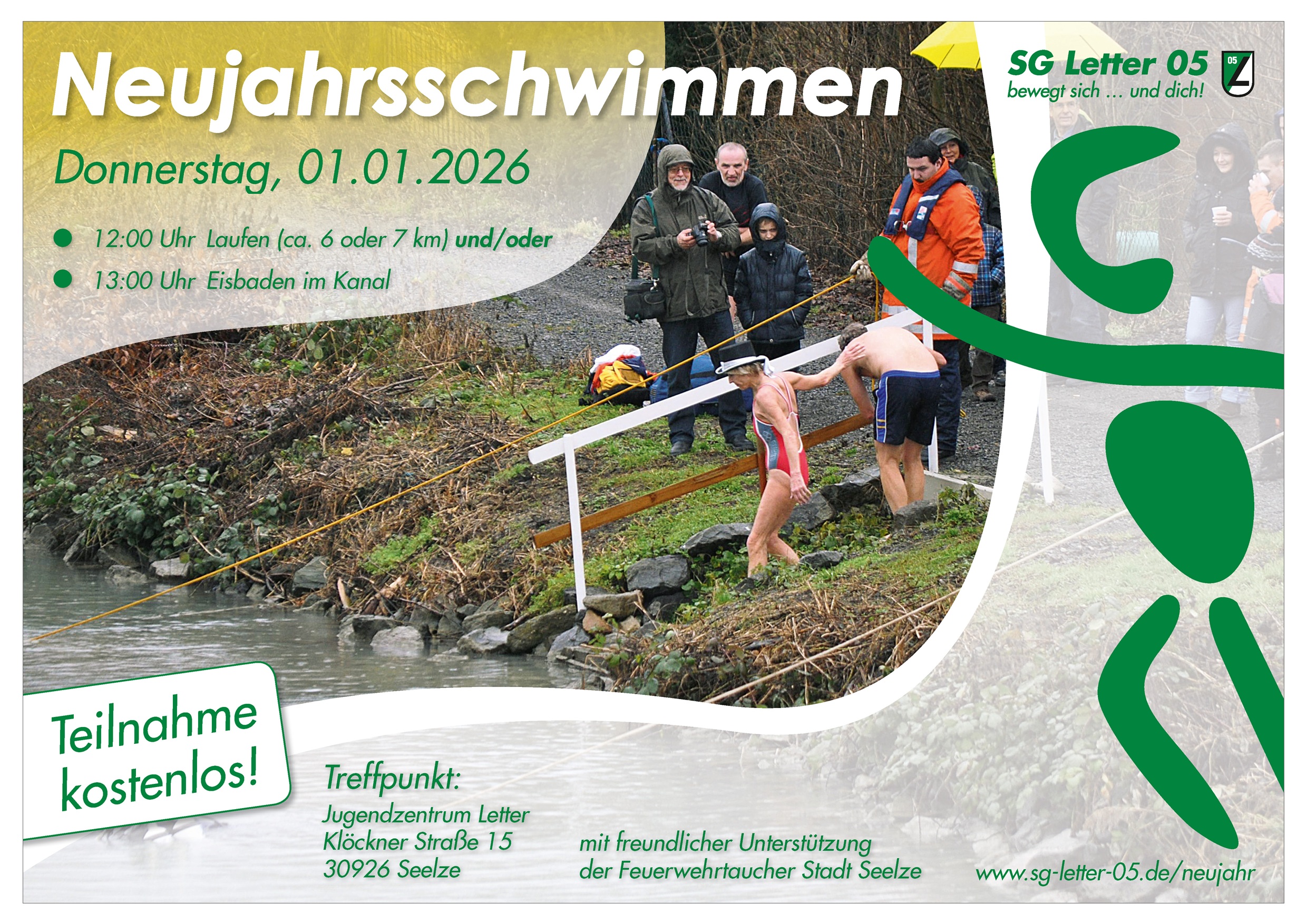 Das Neujahrsschwimmen der Sportgemeinschaft Letter von 1905 e.V. am Donnerstag, 01. Januar 2026, direkt hinter dem Jugendzentrum Letter (Klöckner Straße 15, 30926 Seelze-Letter) ist für