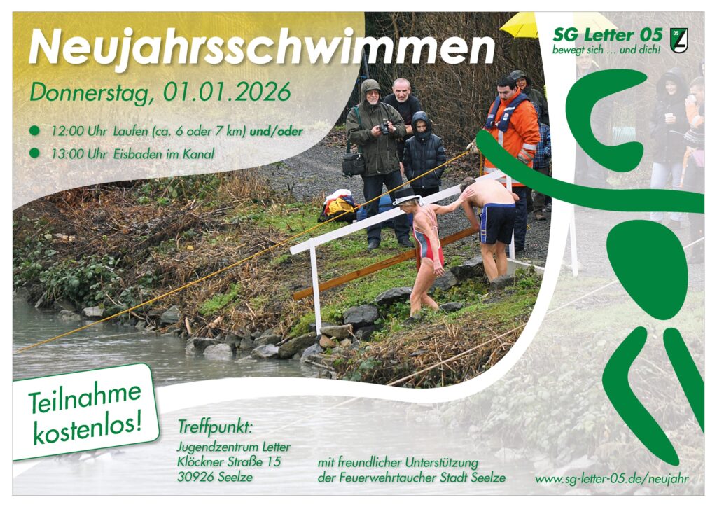 Das Neujahrsschwimmen der Sportgemeinschaft Letter von 1905 e.V. am Donnerstag, 01. Januar 2026, direkt hinter dem Jugendzentrum Letter (Klöckner Straße 15, 30926 Seelze-Letter) ist für alle Wagemutigen und Schaulustigen ein Vergnügen der besonderen Art. Um 12:00 Uhr treffen sich alle interessierten Läuferinnen und Läufer am letterschen Jugendzentrum und laufen gemeinsam eine rund 5 km oder 7 km […]