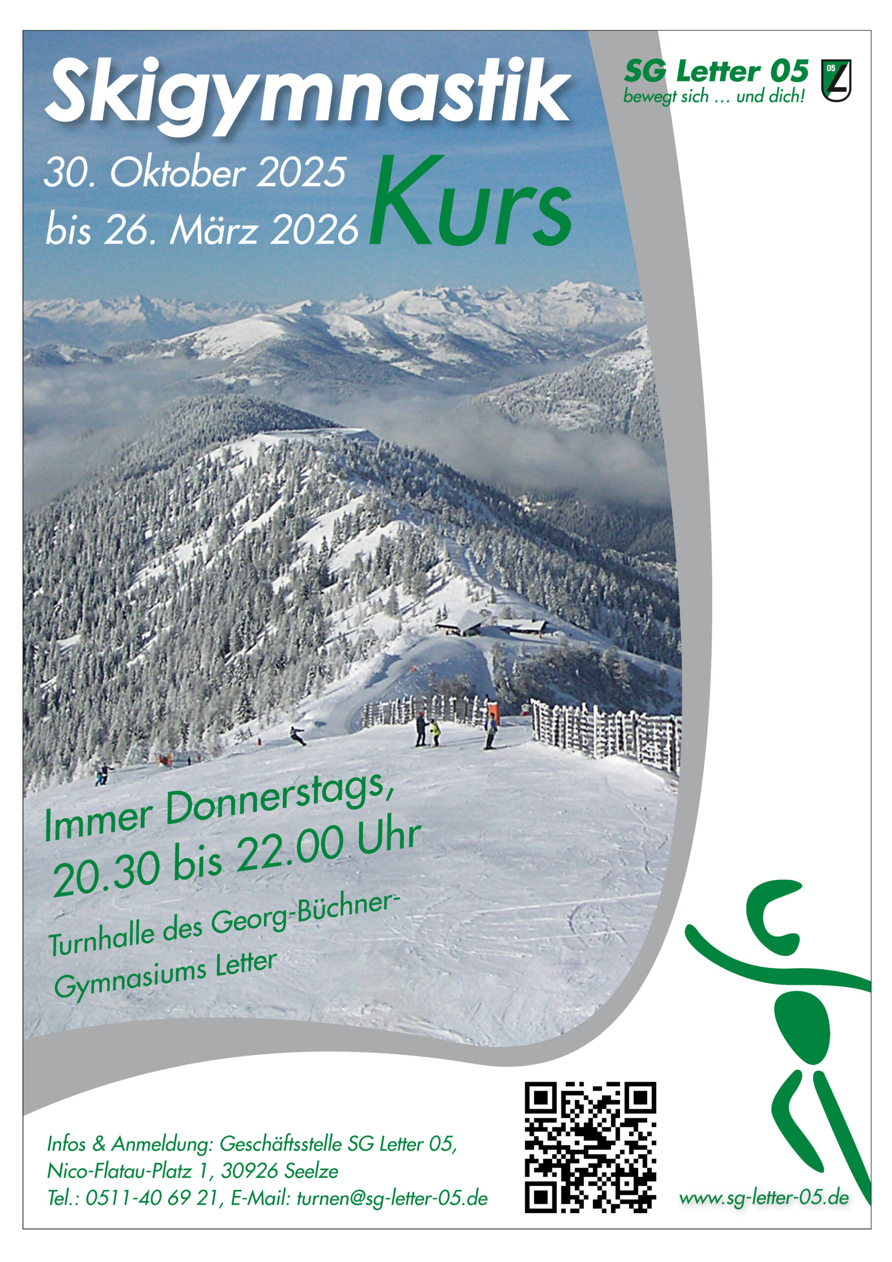 Der Skigymnastik-Kurs beginnt am Donnerstag, 30. Oktober 2025, um 20:30 Uhr in der Turnhalle des Georg-Büchner-Gymnasiums (kleine Halle) in Letter. Sie beinhaltet eine Stunde Skigymnastik und eine halbe Stunde Ballspiele. Dieser Kurs wird Nichtmitgliedern in Form einer Kurzzeitmitgliedschaft für EUR 90,- angeboten. Für aktive Vereinsmitglieder der SG wird ein Sonderbeitrag von EUR 30,- erhoben.